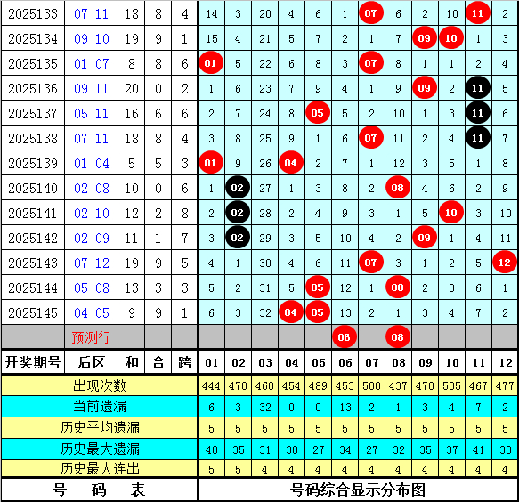 后区判断:上期后区奖号为04和05,开出温码+热码组合。最近十期后区开出10个热码、8个温码和2个冷码,本期预测奖号关爱冷码+热码组合,参考两码06、08。