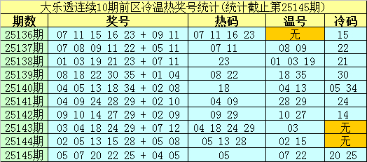 大乐透第25136期-第25145期前区奖号冷温热漫衍统计:
